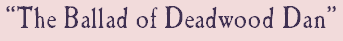 from THE BELLE OF THE WABASH words and music by Mike Craver Sheet music for this song available is hereMy name is Deadwood Dan But I'm not such a terrible man I know I've raised some hell But it don't sit well But now I want to change I want to live free on the range In a charming cottage with a welcome mat And a parlor organ and a Siamese cat Now tell me, good people What you think about that? Nuts -- it don't go with Deadwood Dan He's still a terrible man! Don't you ever get tired of the pose Don't you ever want to stop and smell a rose? Instead of standing like a soldier With a big chip on your shoulder I tell you boys it gives my neck a crick And chawin' makes me sick Chawin' makes him sick?It don't come naturally I'd rather dip snuff, you see With one of them lacy handkerchiefs in tow To help mop up the blow Instead of cow pokin' and dirty jokin' And cigareet smokin' and fights Would you rather curl up with a cup of mint tea And a copy of WUTHERING HEIGHTS? No! I'll build a seminary On the top of Tucumcari And churn out little brothers just like me We'll start a new world order Just west of the Texas border In a charming cottages with welcome mats And parlor organs, and Siamese cats Now tell me good people what you think about that? Nuts -- it don't go with Deadwood Dan He's still a terrible man!