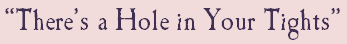from THE BELLE OF THE WABASH words and music by Mike Craver Sheet music for this song available is here Every actor's worst nightmareOne night in Drury Lane, in the fifth act of HAMLET I was just about "to be or not to be" When I heard a stage whisper from Gertrude, in the wings And these were the very words she said to me: "There's a hole in your tights --you're not wearing underpants There's a hole in your tights -- I see England I see France Grab a leaf from a fig or a poke from a pig Get a grip, there's a hole in your tights"I struggled oh so valiantly to pull my tunic down I backed against a column -- I worked my way around To an arras that was hanging, but I couldn't yank it down 'Til the titters of the audience began to resound "There's a hole in your tights --you're not wearing underpants There's a hole in your tights -- we see England we see France Grab a leaf from a fig or a poke from a pig Get a grip, there's a hole in your tights"I probed my nether regions, this brouhaha to stickle Twas then that I discovered the extent of my pickle It seemed the aforementioned hole Had spread from East to West Apparently the twain don't meet So you fill in the rest There's a hole in your tights You're not wearing any bloomers There's a hole in your tights So much for those rumors Grab a leaf from a fig or a poke from a pig Get a grip, there's a hole in your tights
